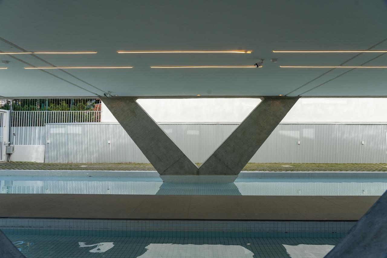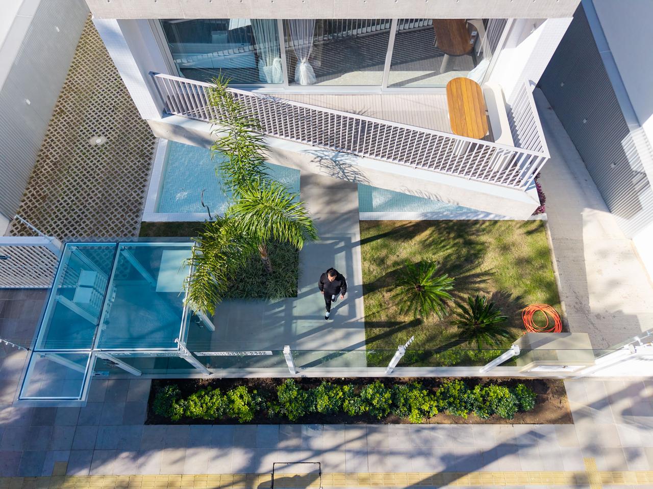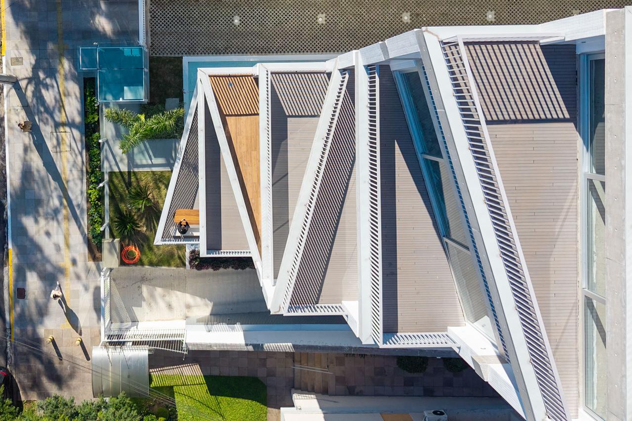Essa sobreposição dos terraços também criou um sentimento de “casa”, com o apartamento totalmente integrado à área externa. Na ponta mais estreita do terraço, tem-se o jardim. Na outra, mais larga, é possível se colocar um espaço de estar bem confortável. E ao olhar para cima, tem-se a visão livre do céu.